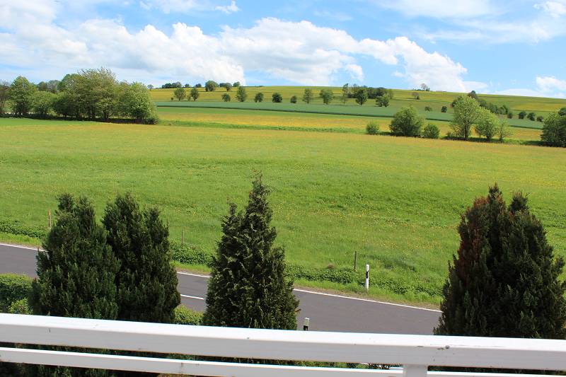 • Balkon mit Sitzplatz und Sonnenschirm.