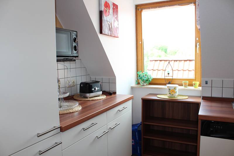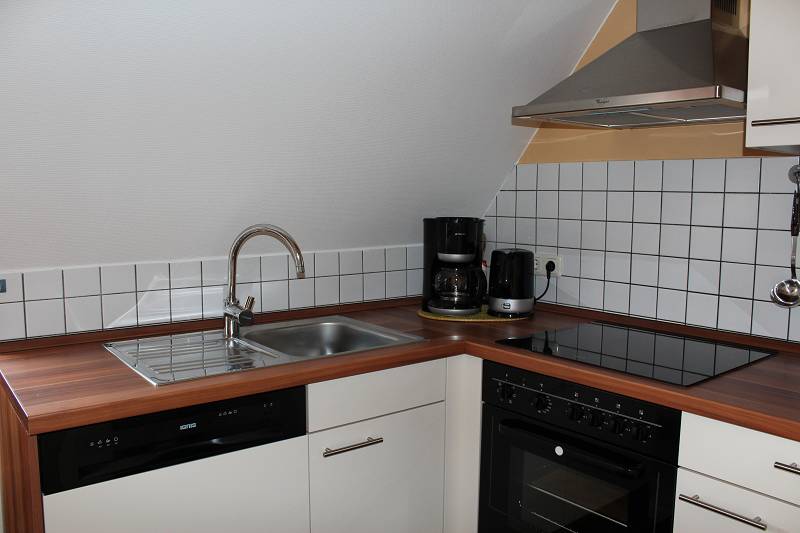 • Küche: Neue Einbauküche mit Spülmaschine, Kühlschrank mit Gefrierfach, Ceranfeld, Backofen, Mikrowelle, Kaffeemaschine, Wasserkocher, Toaster, Eierkocher, Waffeleisen, Geschirr, Spülmittel und Geschirrtücher.